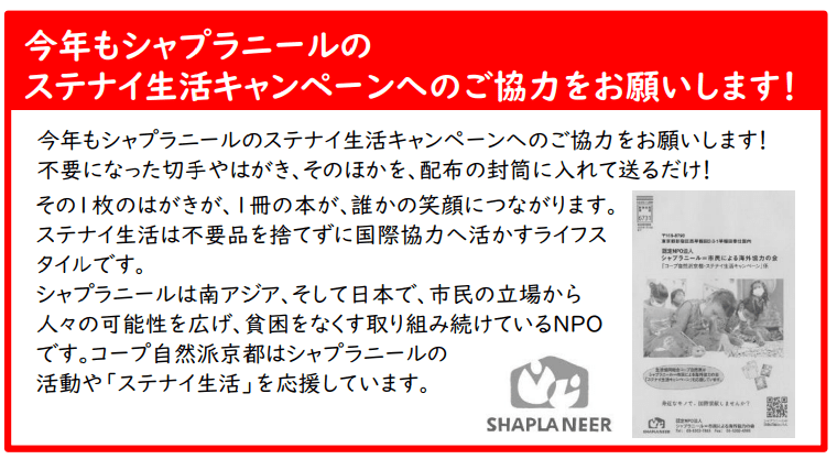 1月30日~配布の機関紙・京通信No.46にて、NPO法人シャプラニールの「ステナイ生活キャンペーン」