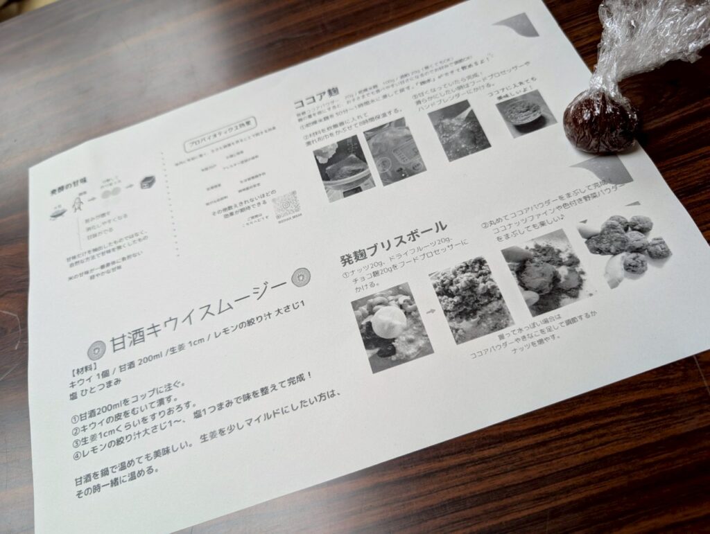 夏休みということで子供と一緒に作れて食べられる甘酒や砂糖不使用のココア麹を使ったおやつを作ってみんなで食べました。小学生のお子さんもココア麹で作るブリスボールを丸めてもらって楽しんでもらえました。甘酒が今まで独特の香りが苦手な方も甘酒キウイスムージーではその香りがなくとても飲みやすい、と言って好評でした。