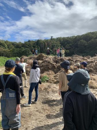 お昼ご飯の後は、歩いて堆肥場に向かいました。地域の方たちが河原で刈った草や剪定枝を置いていかれるそうです。