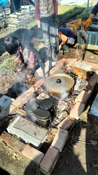 城陽キッズファームで無農薬で大切に育てた野菜を収穫し、焚火班&お味噌汁班&飯盒炊飯班に分かれて野外調理しました。「お味噌汁美味しい!」と、子ども達もたくさん食べて、バッタを捕まえたり畑で走って遊んだり、終始楽しそうな声が聞こえていました。
