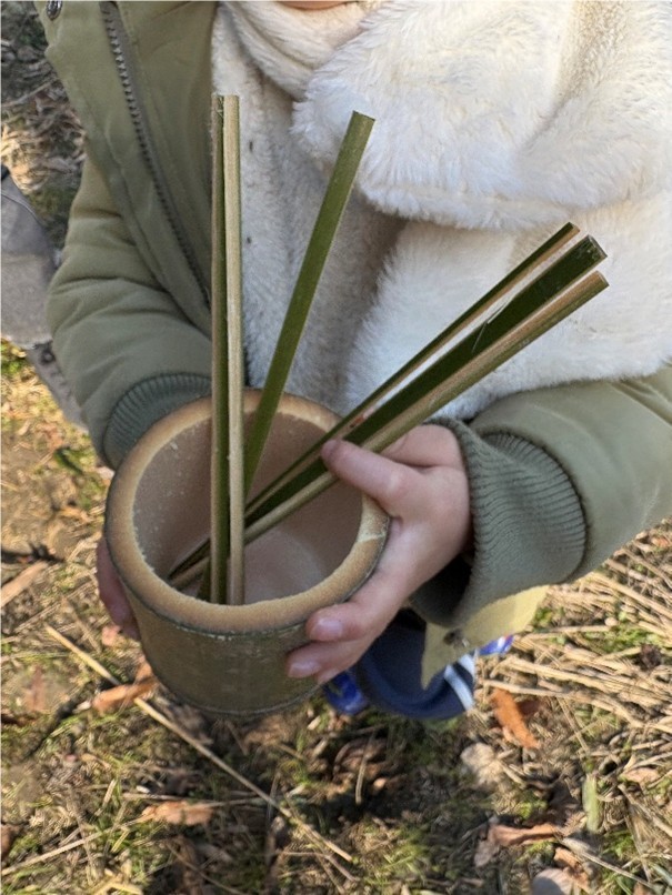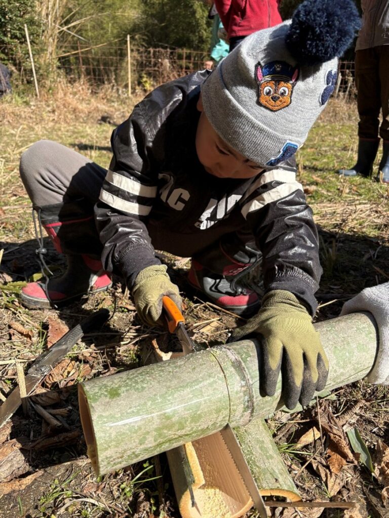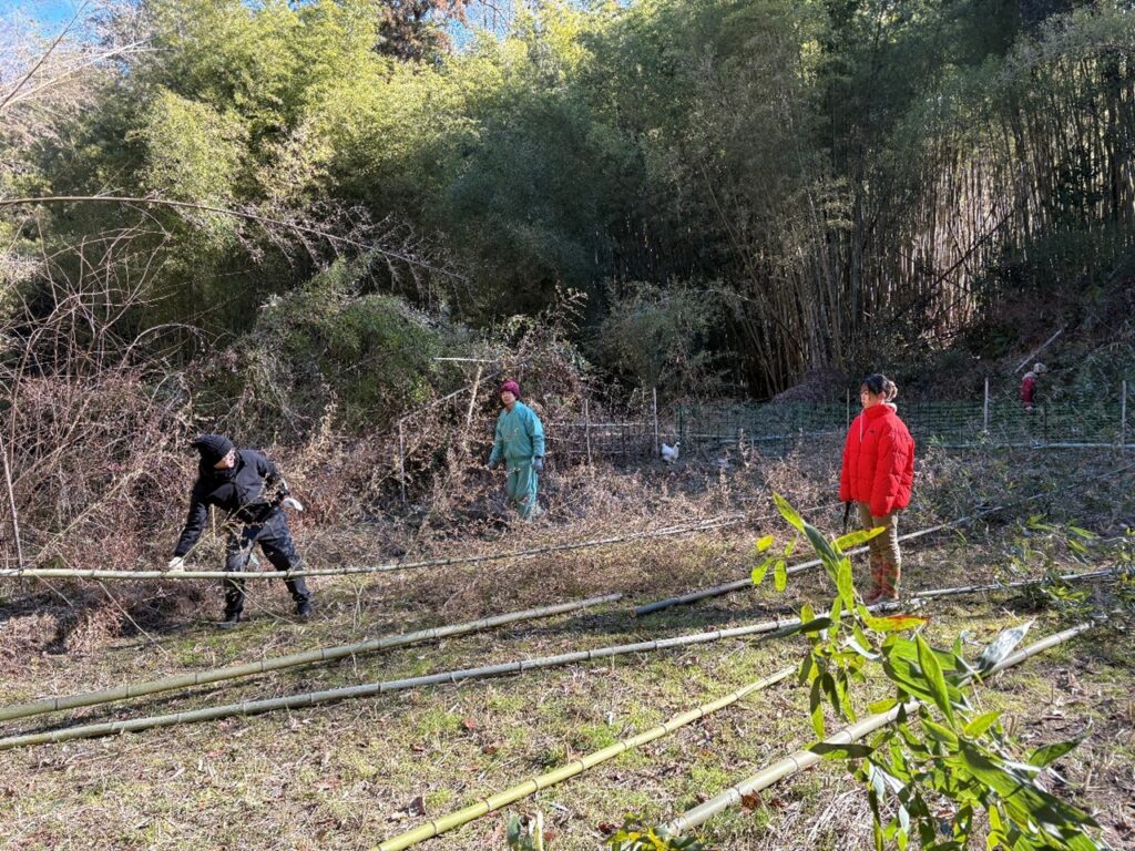田んぼの南側の竹林で竹を切って、田んぼの日当たりをよくしたり、倒れてきそうな竹や通路をふさぐ竹なども切って片付けました。それから竈に薪をくべて豚汁を作りながら、切った竹で器やお箸を作りました。寒い日でしたがイベント中はいいお天気で一生懸命竹を切ったり豚汁を食べたので暖まりました。
